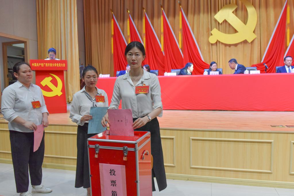 大会首先表决通过了大会选举办法,通过了监票人、总监票人名单,并宣布计票人、总计票人名单,及“两委”候选人名单。在总监票人和监票人监督下,到会有选举权的234名党员以无记名投票方式,选举产生了中国共产党广西开放大学新一届委员会委员和纪律检查委员会委员。